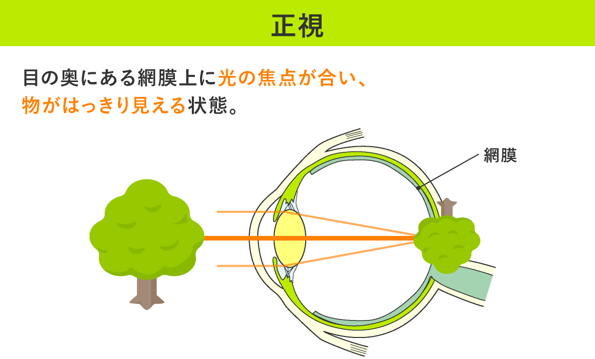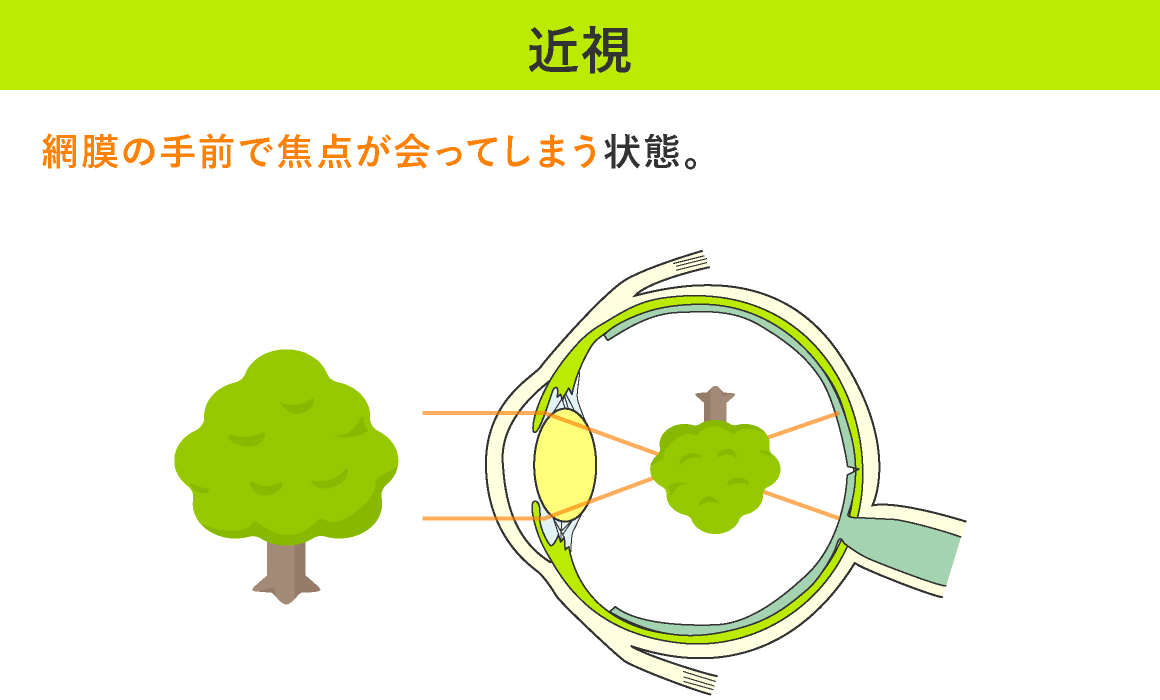 近視は、屈折力が強すぎ網膜の手前で焦点が合ってしまい、近くは見えますが遠くはぼやけてしまいます。