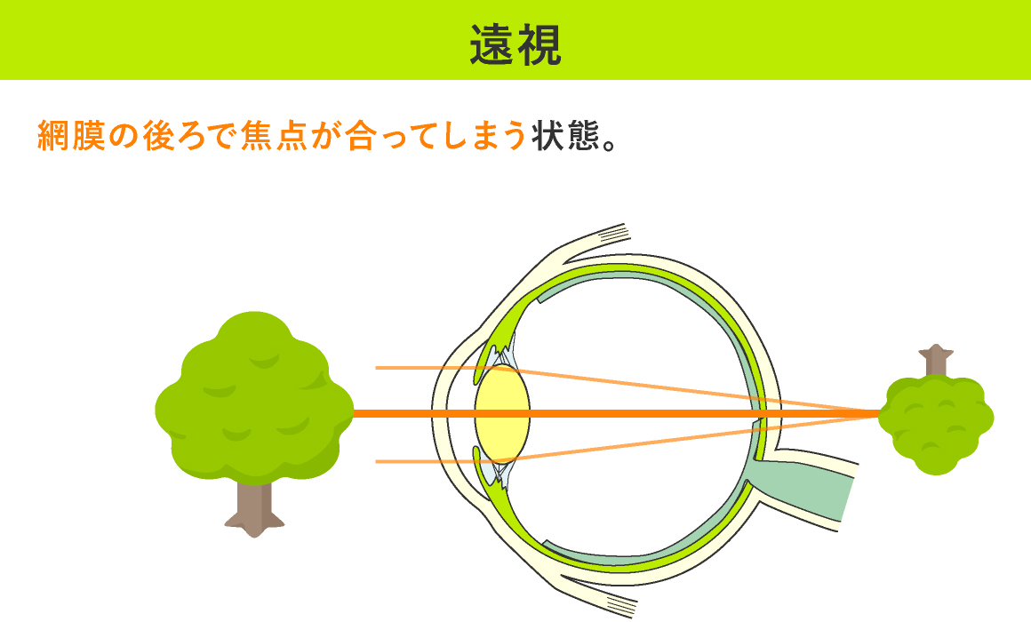 遠視は、屈折力が弱すぎて網膜の後ろで焦点が合ってしまい、近くも遠くもぼやけてしまいます。