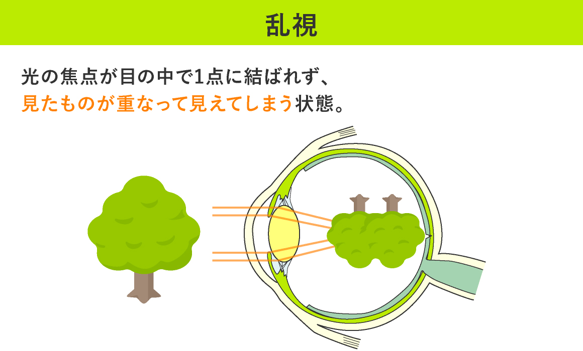 乱視は、角膜の形状が楕円にひずんでいるため目の縦と横の屈折度が異なる結果、焦点がどこにも合わず遠視以上に目が疲れやすいといわれています。また、乱視は近視や遠視の目にも起こります。不同視は左右の視力、例えば右の視力が1.0で左の視力が0.1というように、両目の屈折度数に大きな差があることをいいます。